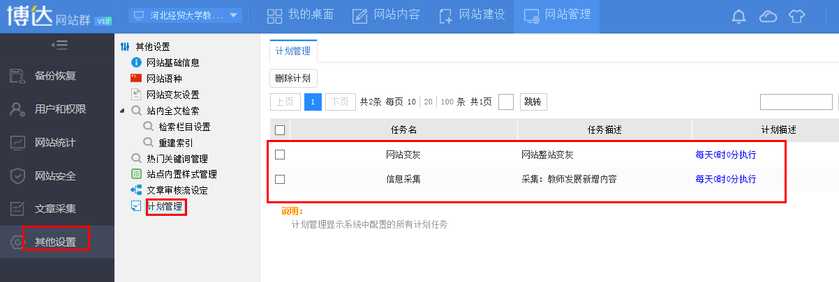 网站管理中的计划管理是显示系统中配置的所有计划任务,比如在文章采集中设置了采集计划,网站变灰设置了计划,都可以在计划管理中进行删除和查询,如图: