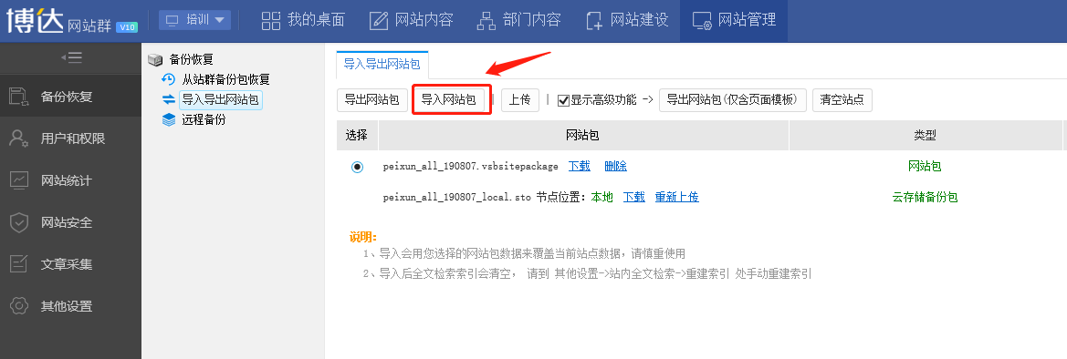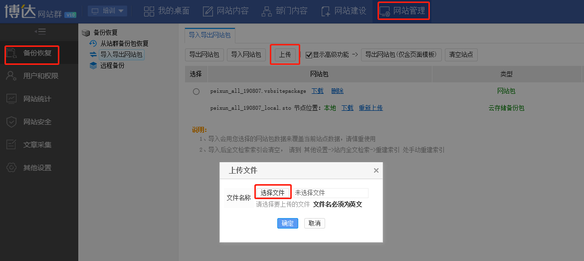 注意:导入选择的网站包数据会覆盖当前站点数据,请慎重使用