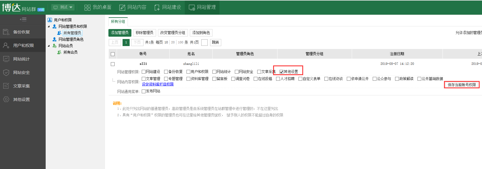 1.网站管理》用户与权限》网站管理员和权限;勾选其他设置,点击保存当前账号权限,其他设置包括一些重建索引,修改网站基本信息,以及一键变灰的功能。