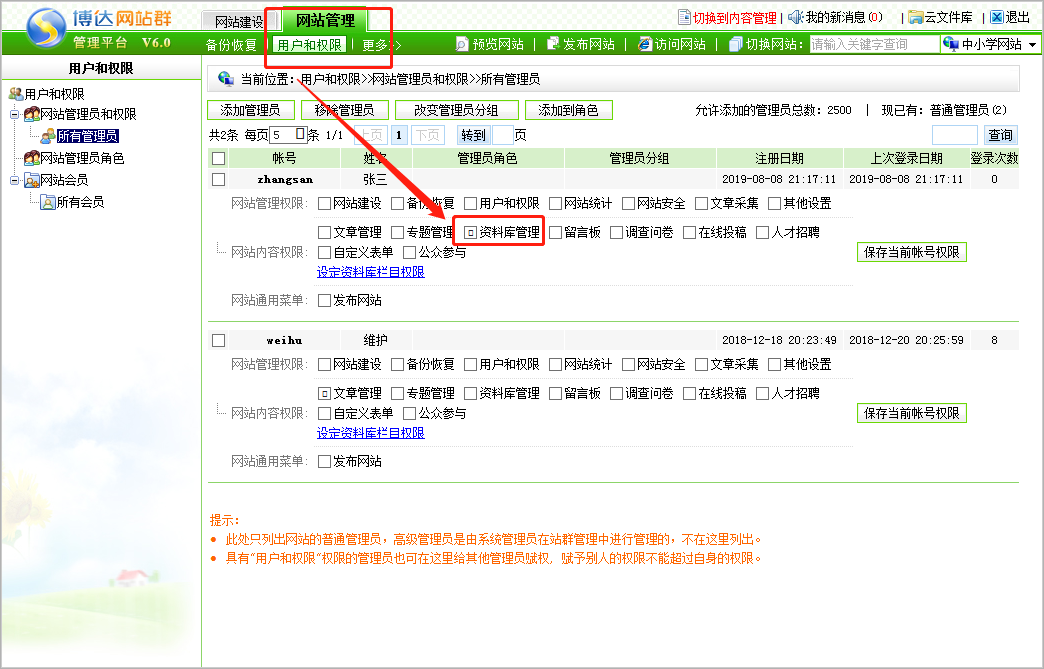 第一步:登录后台网站管理——用户和权限——所有管理员页面,右侧查询找到需要添加维护文章的管理员,然后选中资料库管理,点击保存当前账号权限即可。