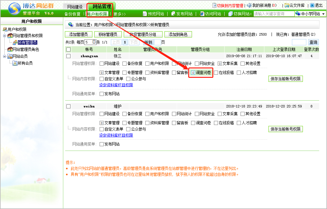 登录后台网站管理——用户和权限——所有管理员页面,右侧查询找到需要添加维护文章的管理员,然后点击选中调查问卷,保存当前账号权限;