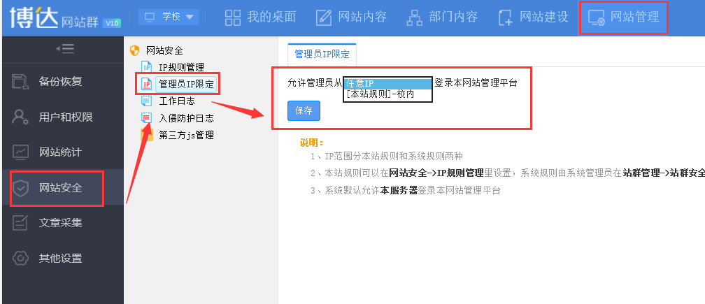 1.登陆网站管理,网站管理-ip规则管理,先添加ip规则,如校内;(注:如果系统管理已经设置有ip规则,只需要直接看第二步进行设置即可)