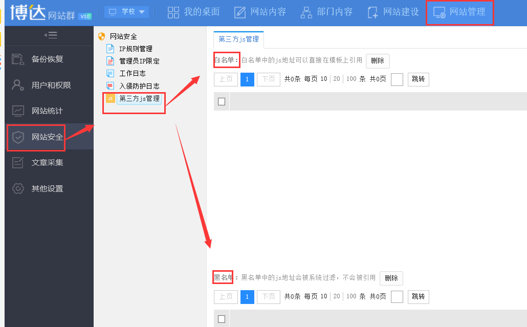 1.第三方js管理功能是在网站管理-网站安全-第三方js管理,js管理中有白名单和黑名单,如果将js加入白名单,则白名单中的js地址可以直接在站点模板上使用;如果将js加入黑名单,则js地址会被系统过滤,不被引用。