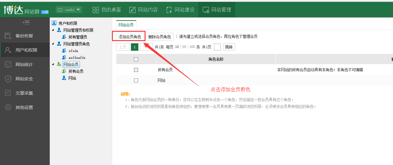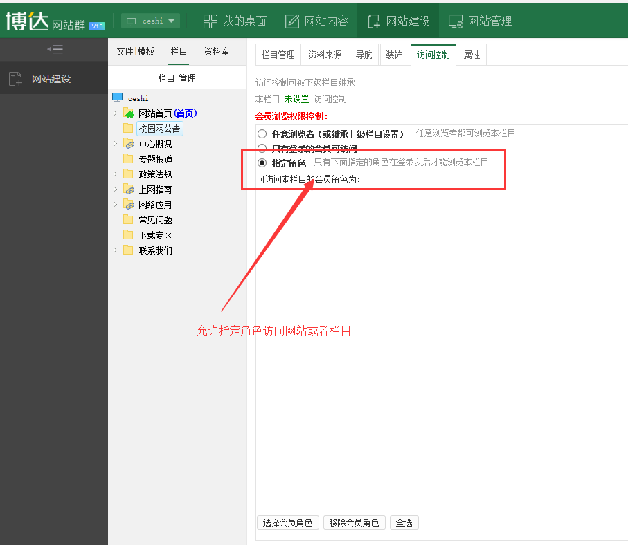 网站管理》用户与权限》网站会员;点击添加会员角色——点击添加的会员角色,选择已有的会员添加到本角色——下一步到网站建设》栏目》访问控制——选择指定角色,选择会员角色。当前台访问时需要登录这些指定的会员角色才能访问网站。