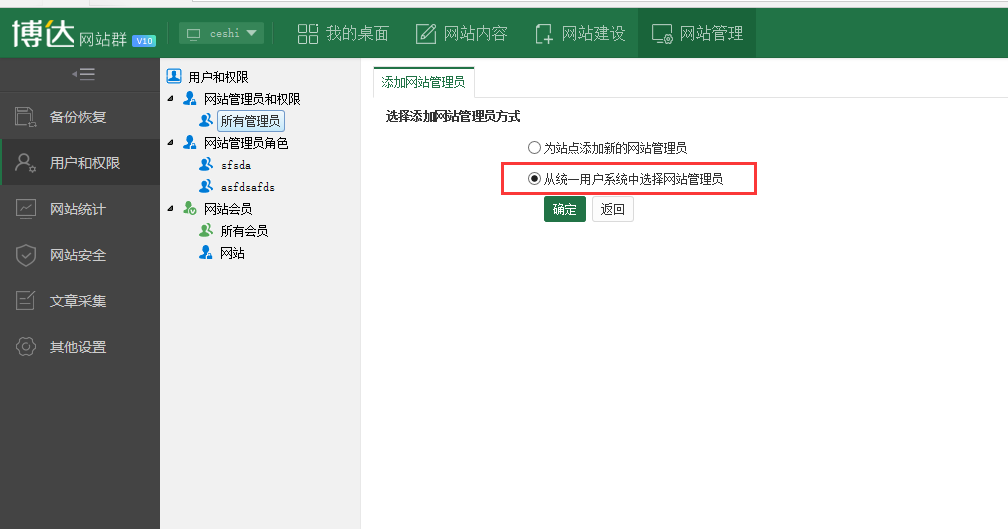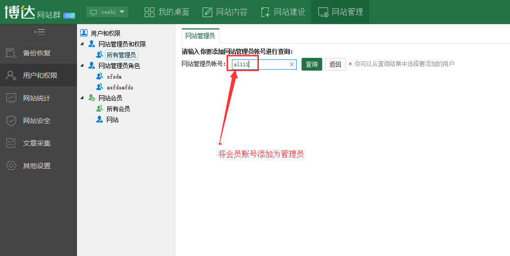 网站管理》用户与权限》;点击到所有管理员——添加管理员——选择从统一用户系统中选择网站管理员——添加会员账号为管理员,为管理员分配权限,会员就可以登录后台维护网站了。