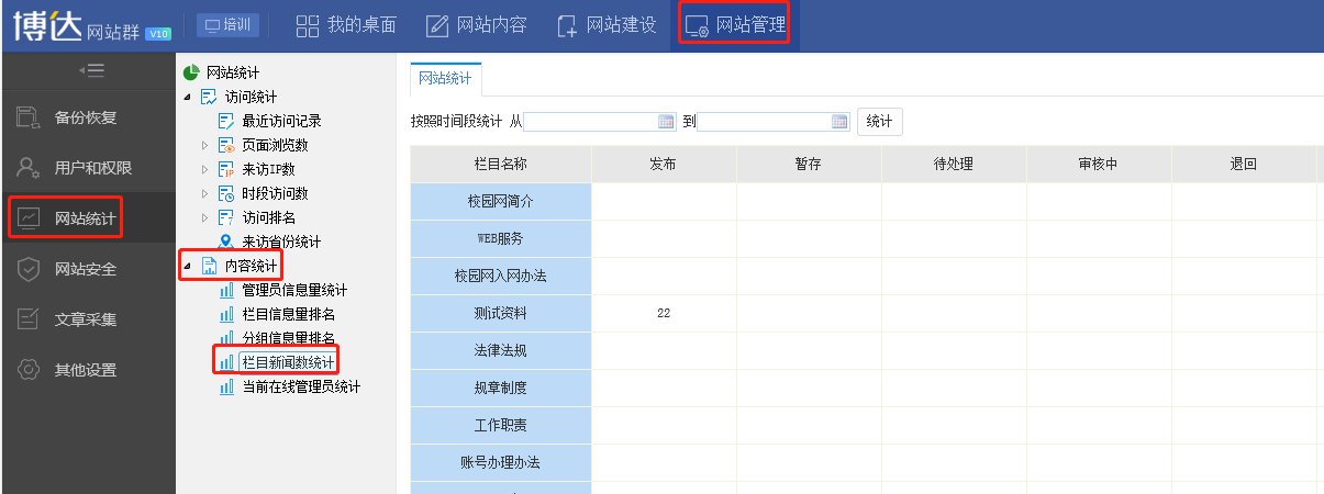 —网站统计—内容统计—选择栏目新闻数统计即可查看栏目对应的文章条数及所有栏目的文章数,如图所示: