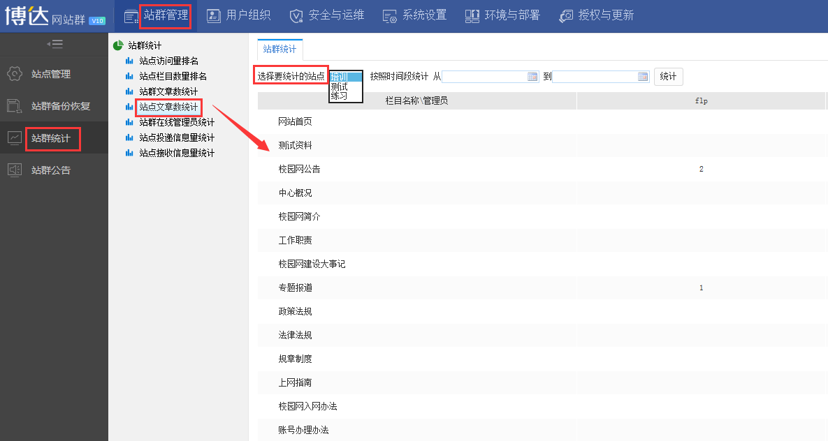 在系统管理下,站群管理-->站群统计-->站点文章数统计下可以查看,可以选择要查看的站点,如图: