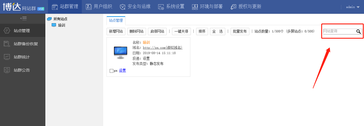 在系统管理—站群管理—站点管理—选择右侧搜索,输入所需站点搜索即可,如图所示: