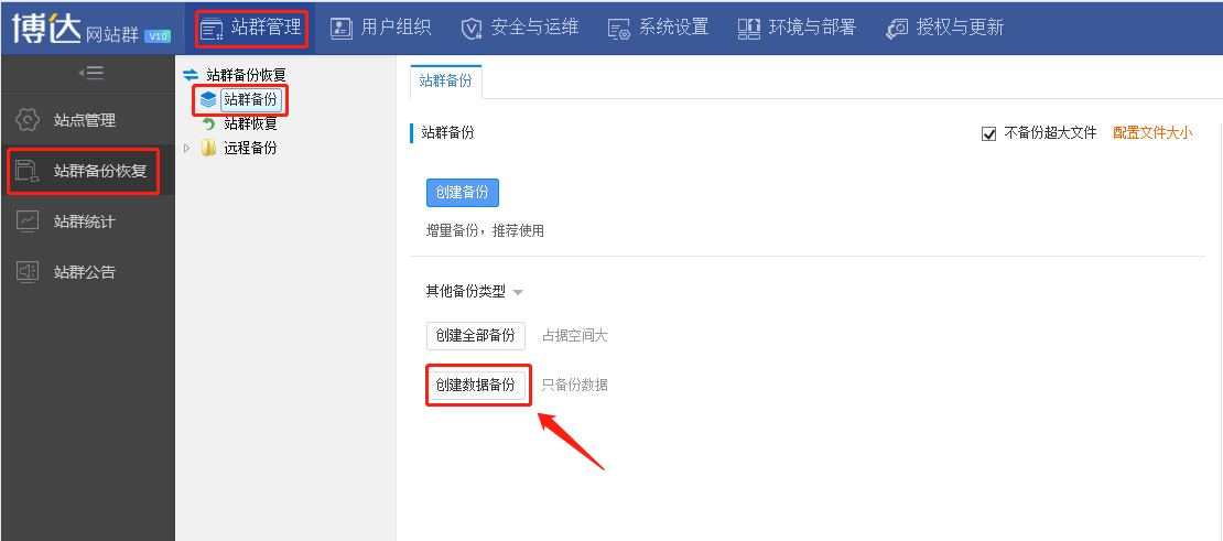 在系统管理—站群管理—站群备份恢复—站群备份中,选择创建数据备份即可,如图所示: