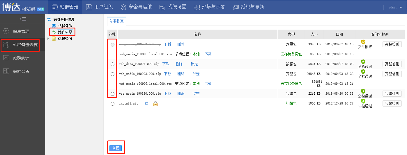 在系统管理—站群备份恢复—站群恢复—选择需要恢复的备份包,点击恢复即可,如图所示: