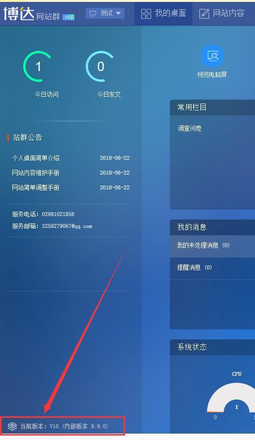 方法二:可以在网站管理中,内容管理-->我的桌面中可以查看产品版本,如图: