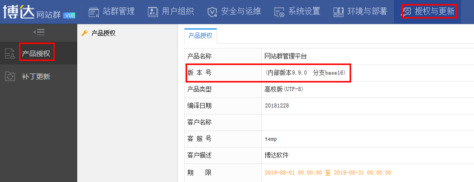 方法一:在系统管理中,授权与更新-->产品授权中,版本号可查看产品的版本,如图: