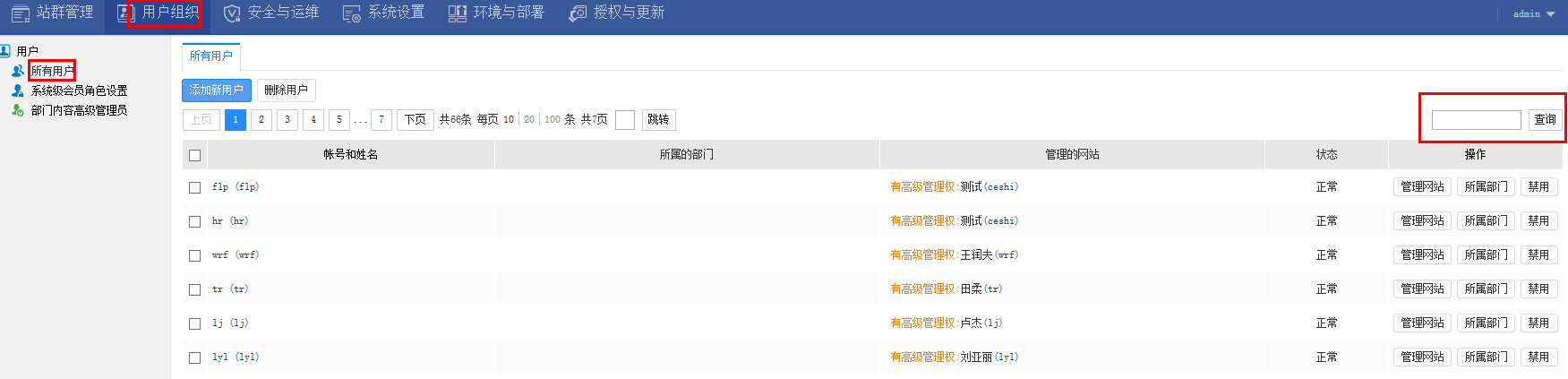 在系统管理中,用户组织-->用户--> 所有用户下,有个查询框,输入用户账号或名称即可查找用户,如图