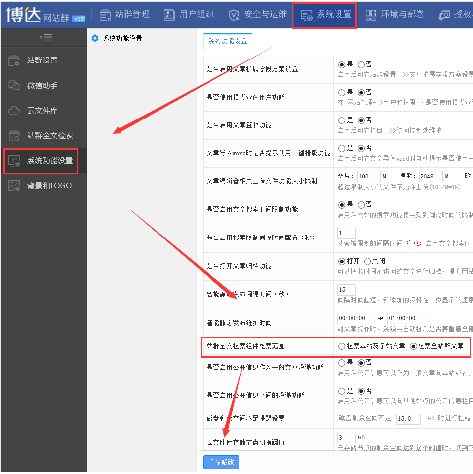 1.登陆系统管理,系统设置-系统功能设置-站群全文检索组件范围设置,可以设置站群文章或者本站点文章。设置为检索本站及子站点文章时,在哪个站点进行的搜索,搜索出来的结果是当前站点以及他的子站点的所包含搜索关键字的文章;如果设置为检索全站群文章,不管在哪个站点进行搜索,搜索出来的结果都是整个站群中所包含搜索关键字的文章。