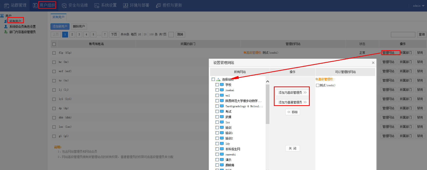 选择管理的网站后,可以选择这个用户添加为该网站的高级管理员或者普通管理员,高级管理员在网站管理中拥有网站的所有权限,普通管理员则是需要改站点高级管理员给设置网站管理的对应权限,添加好后该用户即可登录网站,对网站进行一些文章或者是设置的操作了,否则登录会提示无可管理内容,无法登录。