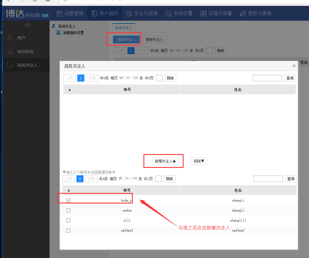 1.登陆系统管理,用户组织-系统关注人,点击选择关注人,选择关注人账号,新增,系统关注人可以接受一些系统安全运维等方面的消息。