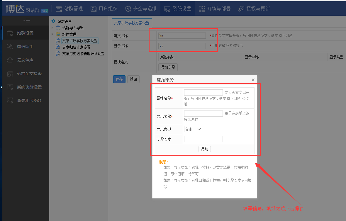 1.登陆系统管理,系统设置-站群设置-文章扩展字段方案设置,点击新增模板,填写扩展字段的名称和字段信息,点击添加;扩展字段方案就设置好了,shi'yong。