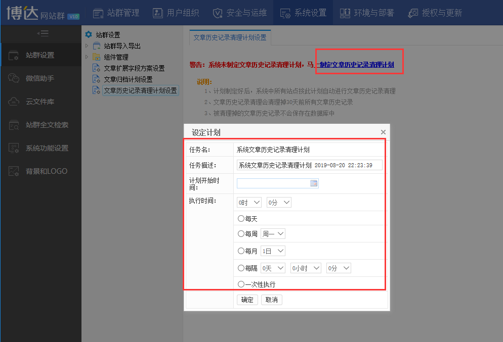 1.登陆系统管理,系统设置-站群设置-文章历史记录清理计划设置,点击制定文章历史记录清理计划,配置清理计划,点击确定;系统将会按照计划对30天前的所有文章历史记录进行清理,。