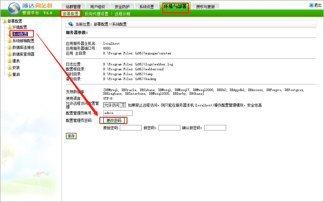 登录后台系统管理——环境与部署——部署配置——系统配置页面,右侧点击更改密码;