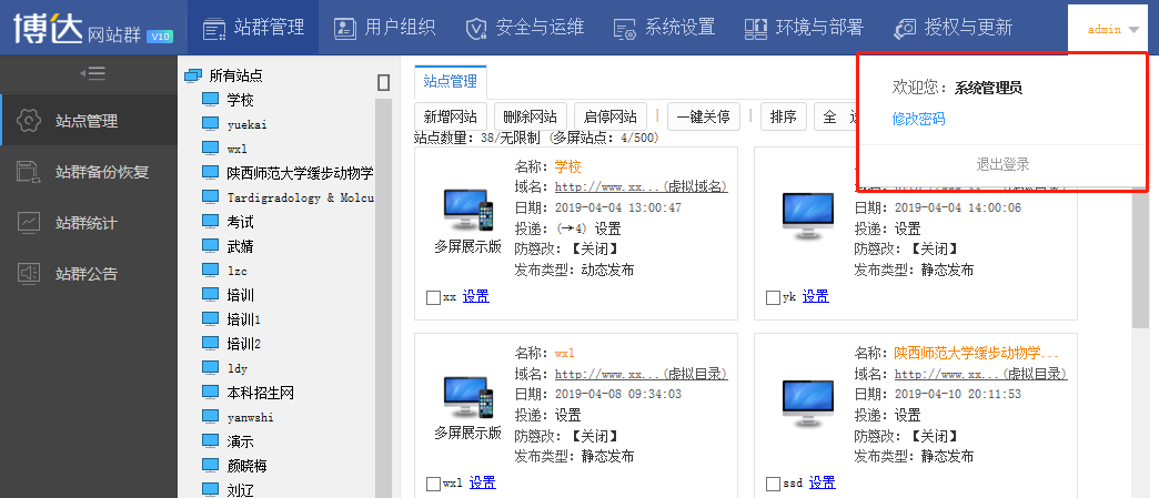 登录后台系统管理页面,鼠标移到右上角账号处,点击修改密码;