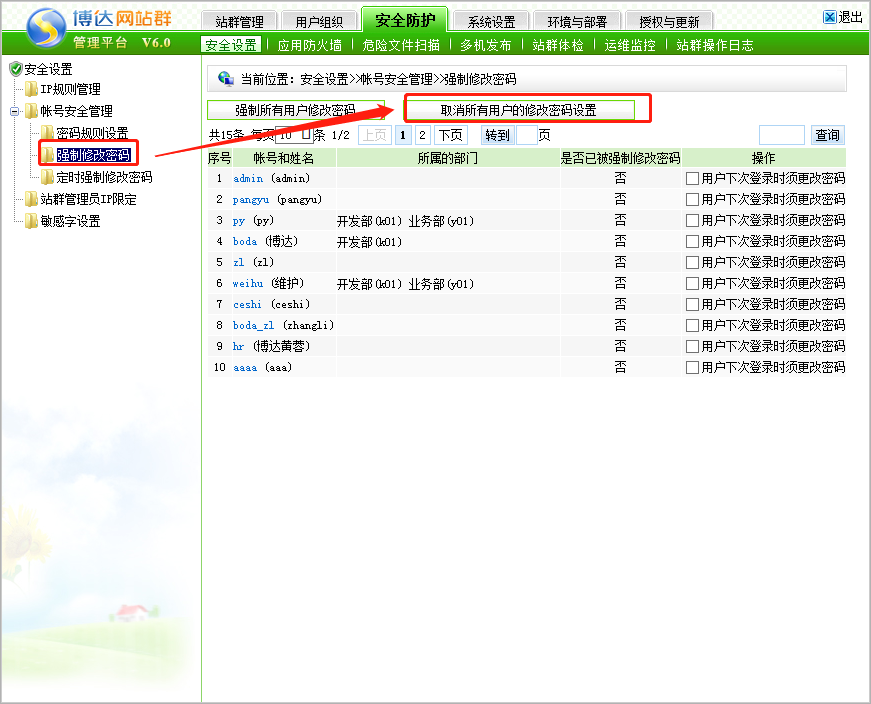 登录后台系统管理——安全防护——安全设置——账号安全管理——强制修改密码页面,右侧点击取消所有用户的修改密码设置;