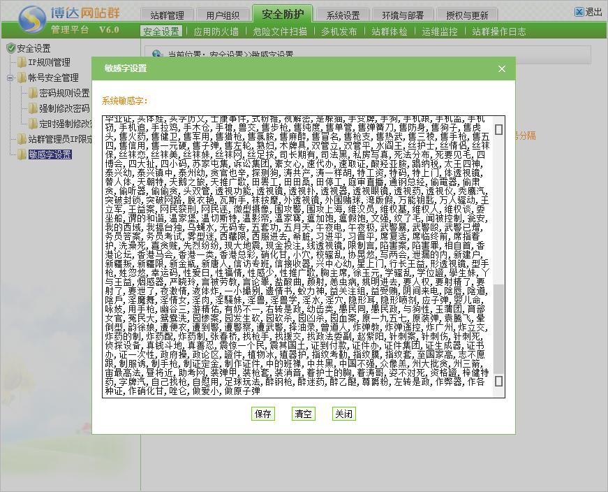 登录后台系统管理——安全防护——安全设置——敏感字设置页面,右侧点击“这里”;