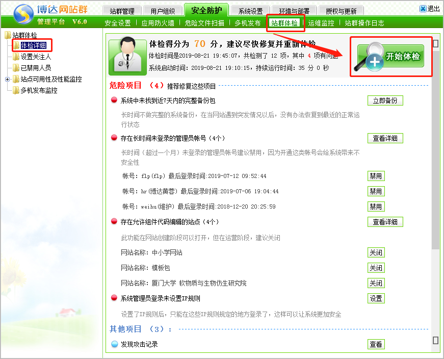 登录后台系统管理——安全防护——站群体检——体检详细页面,右侧点击开始体检;