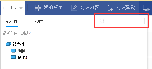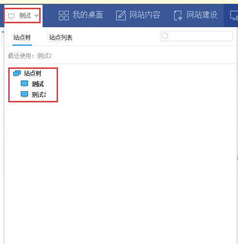 V10版本,登录网站管理后,在左上角站点名称点击可以出现该管理员管理的所有网站的树结构,点击要切换的网站,即可切到对应的站点,如图:
