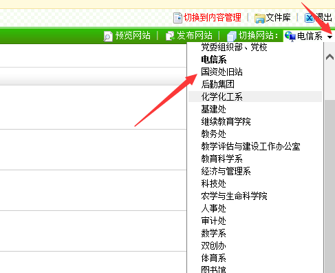 其他版本,登录网站管理后,切到网站管理,在右上角点击三角符号可以出现该管理员管理的所有网站,点击要切换的网站,即可切到对应的站点,如图: