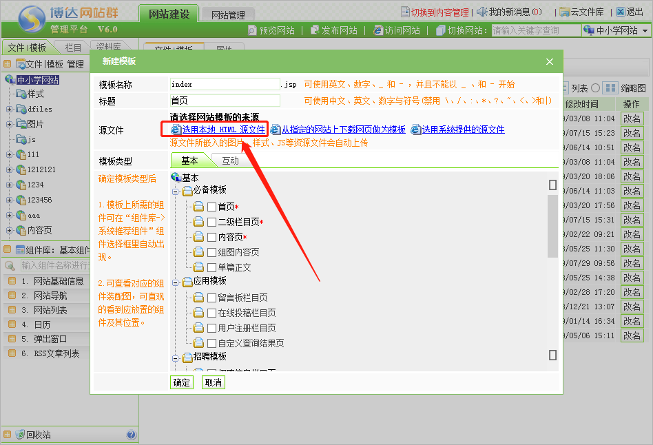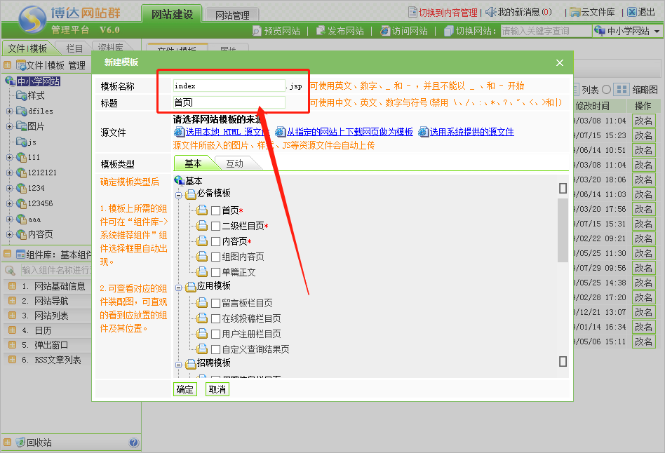 第二步:如果新建网站首页,模板名称必须起名为index;如果新建其他页面,可以自行命名;