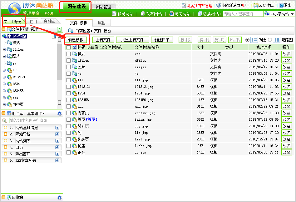 第一步:登录后台网站管理——网站建设——文件/模板,右侧点击新建模板;