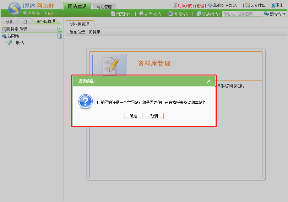 第一步:登录后台网站管理,系统会弹出“目前网站还是一个空网站,您是否要使用已有模板来帮助您建站”窗口,点击确定;