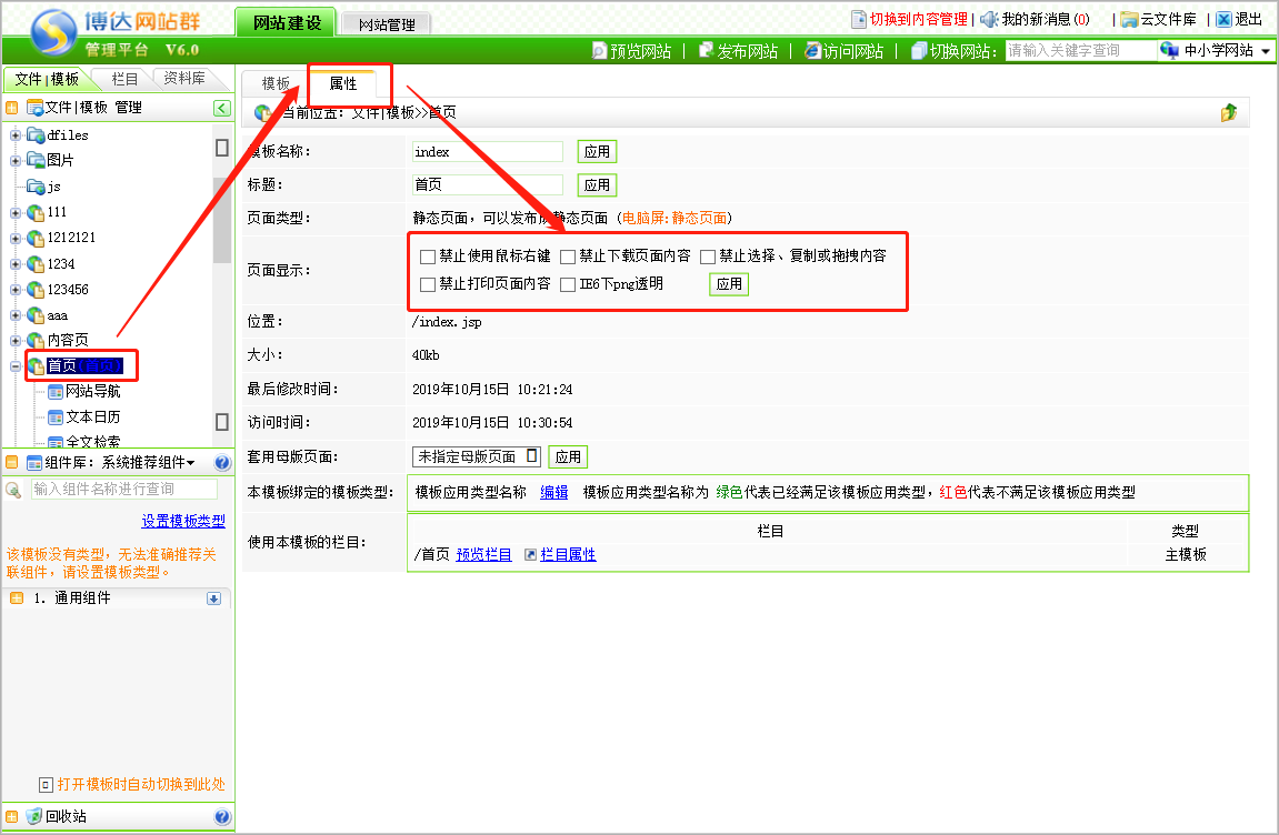 登录后台网站管理——网站建设——文件/模板,点击对应模板属性,在页面显示位置选中禁止下载页面内容,点击应用即可;