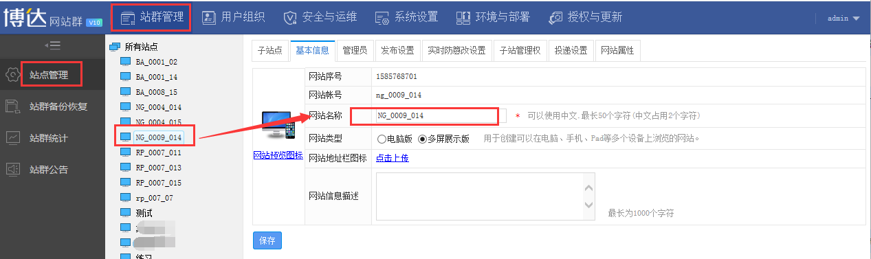 登录系统管理-站点管理-点击对应修改的网站基本信息,修改网站名称即可,如下图所示:
