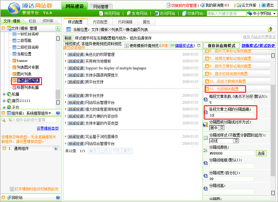 第一步:登录后台网站管理——网站建设——文件/模板,点击列表页的静态翻页列表组件,在组件右侧设置中分段相关配置,在各段文章之间的分隔距离中输入相应的大小,点击保存即可。