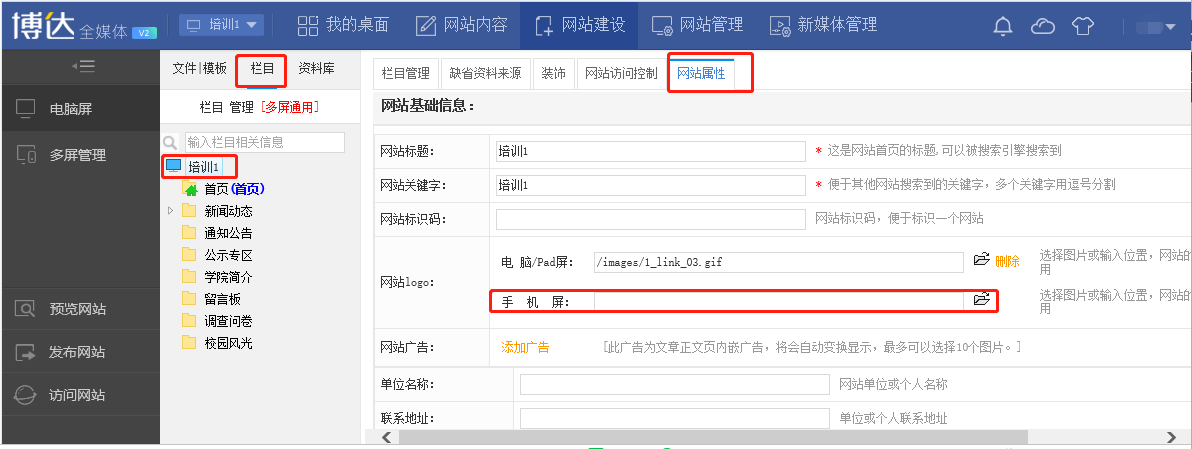 在网站建设—栏目—点击站点名称—网站属性,在手机屏设置log图片即可,如图所示: