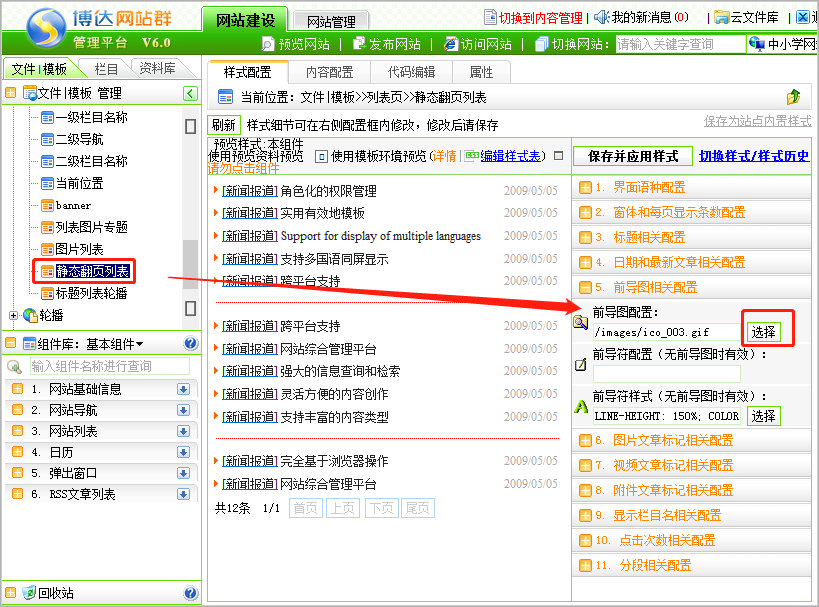 第一步:登录后台网站管理——网站建设——文件/模板,点击列表页的静态翻页列表组件,在组件右侧设置中前导图相关配置,点击前导符配置选择想要添加的小图标,点击保存即可。