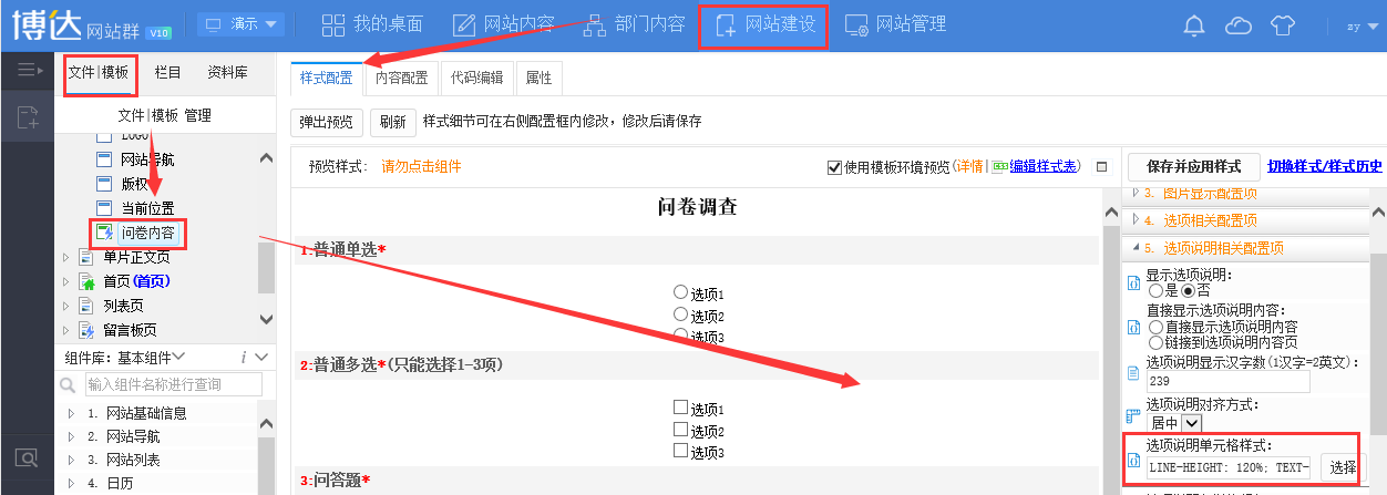 1.登录网站管理,在网站建设-文件|模板,找到对应的问卷内容的组件,点击组件在组件样式配置里面设置选项说明的样式,并保存