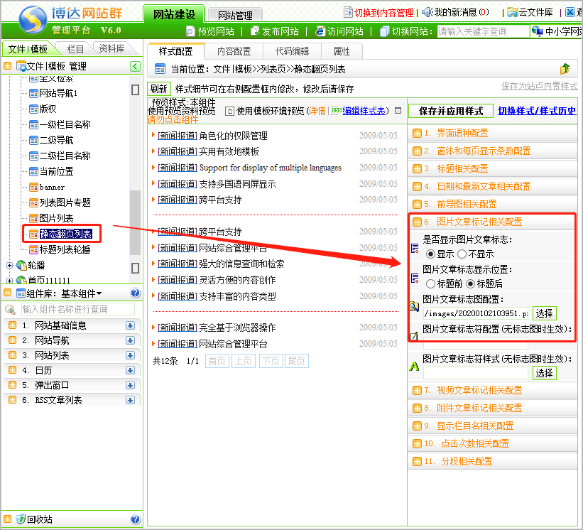 第一步:登录后台网站管理——网站建设——文件/模板,点击列表页的静态翻页列表组件,在组件右侧设置中图片文章标记相关配置,选择显示图片文章标志,标志的显示位置,点击图片文章标志图配置选择想要添加的小图标,点击保存即可。