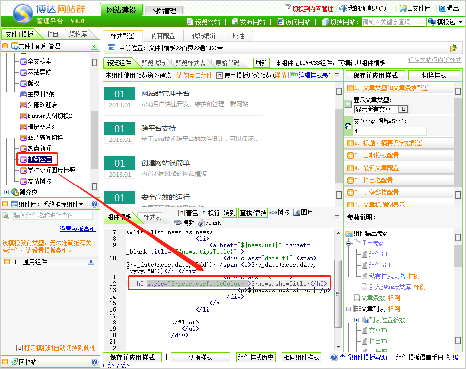 第一步:登录后台网站管理——网站建设——文件/模板,点击对应的标题列表组件,在标题字段的标签中添加 style="${news.cssTitleColor}" (注意:标点符号必须是英文),点击保存即可。