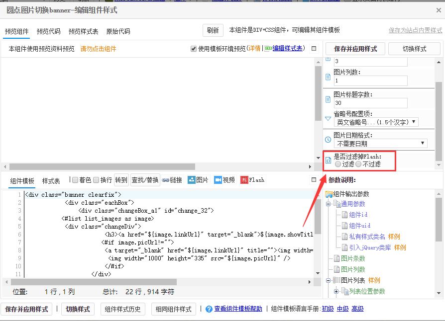 第一步:登录后台网站管理——网站建设——文件/模板,点击需要修改的图片列表组件,在组件右侧设置中选择过滤掉flash。