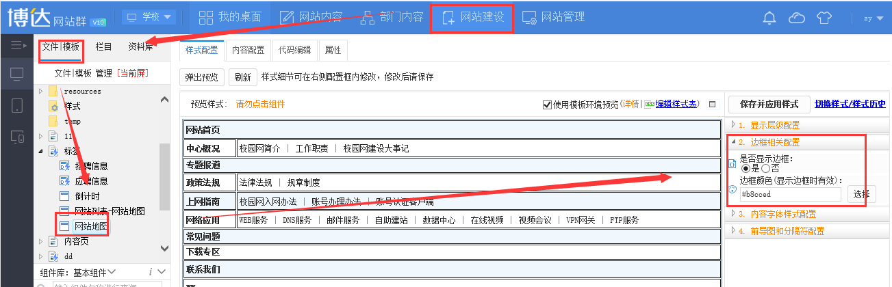 1.登录网站管理,在网站建设-文件|模板找到对应的网站地图的组件,点击组件,在组件样式配置里面进行表格线是否显示的配置,还可以设置表格线的颜色,然后保存即可