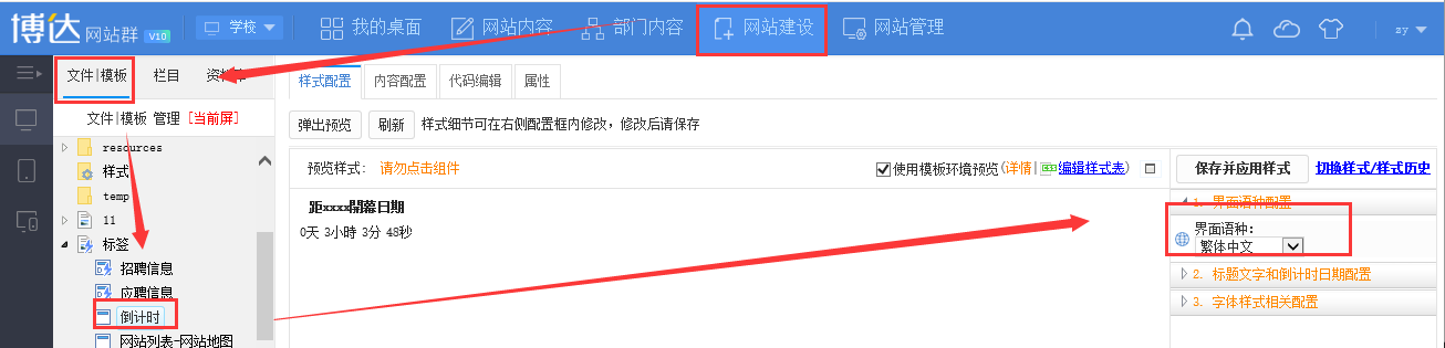 1.登录网站管理,在网站建设-文件|模板找到对应的倒计时的组件,点击组件在组件样式配置右面进行倒计时界面语种的设置,设置好后保存即可
