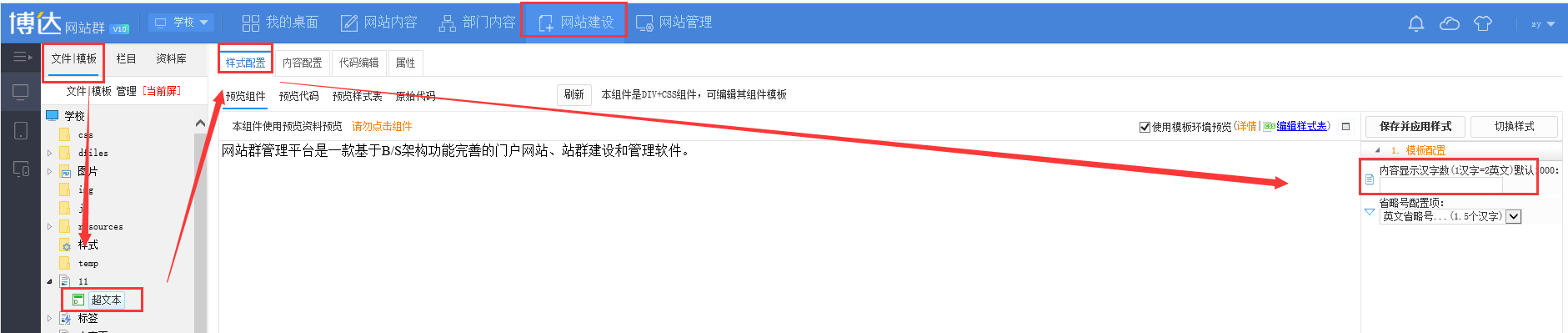 登录网站管理,打开网站建设-文件模板,找到对应的超文本组件,点击打开在组件样式配置里面设置超文本字数,保存即可