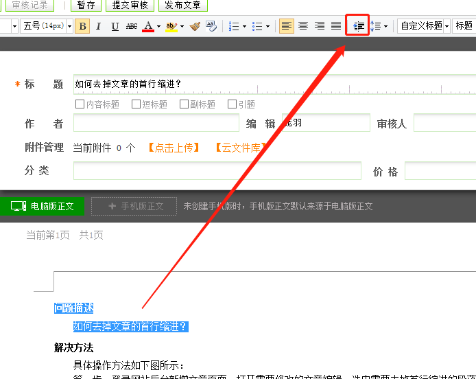 第一步:登录网站后台新增文章页面,打开需要修改的文章编辑,选中需要去掉的首行缩进的段落,点击一下编辑器上方的首行缩进按钮,文章段落会显示出首行缩进,如果想要去掉首行缩进,需要再次点击首行缩进按钮,然后发布文章即可。