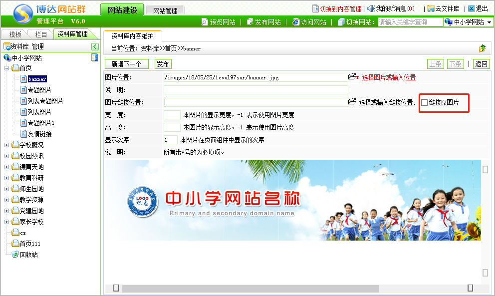 第一步:登录后台网站管理——网站建设——资料库管理,点击需要设置的图片资料页面,在图片链接位置后面选中链接原图片,点击发布即可。