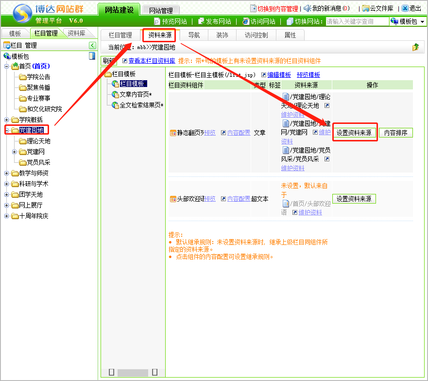 第一步:登录后台网站管理——网站建设——栏目管理,点击需要设置的栏目,点击资料来源,然后设置资料来源。