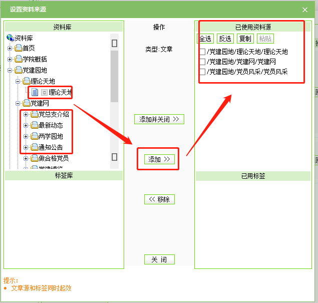 第二步:在左边资料库选择此栏目的所有子栏目的资料,然后点击添加,我们选择的资料源就会显示在右边列表中,点击关闭之后,预览栏目即可查看效果。