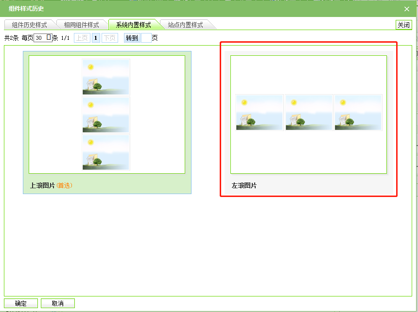 第二步:点击打开组件,在组件代码下方点击组件样式历史,选择系统内置样式中的第二种左滚图片,点击确定保存即可。
