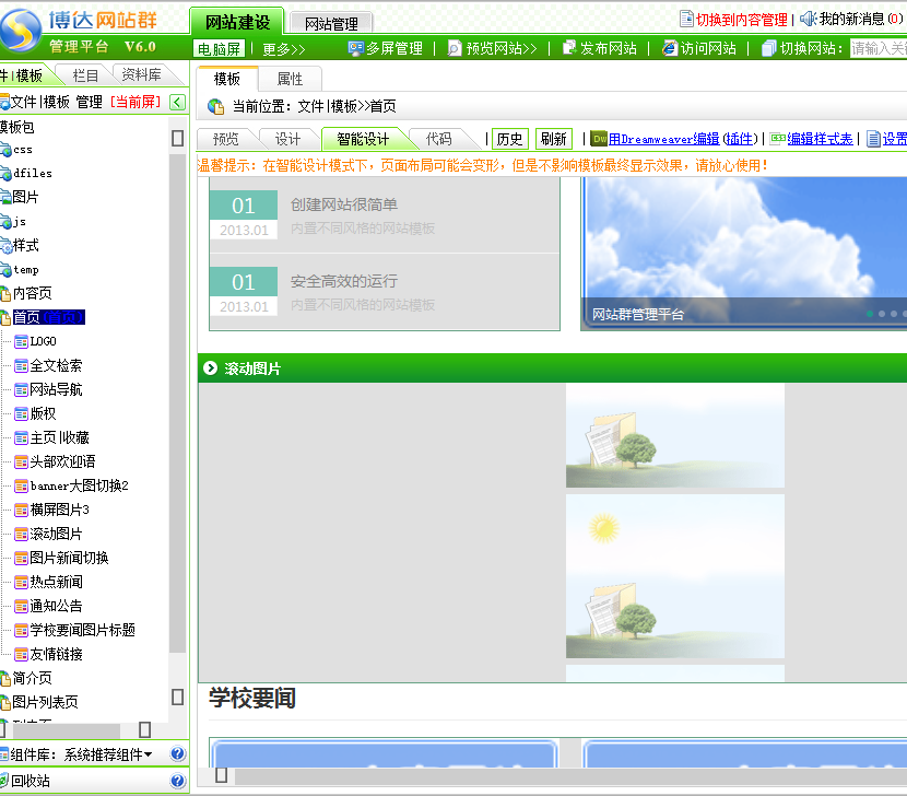 第一步:登录后台网站管理——网站建设——文件/模板,在页面上添加了滚动图片组件之后,页面上会显示成上滚图片。